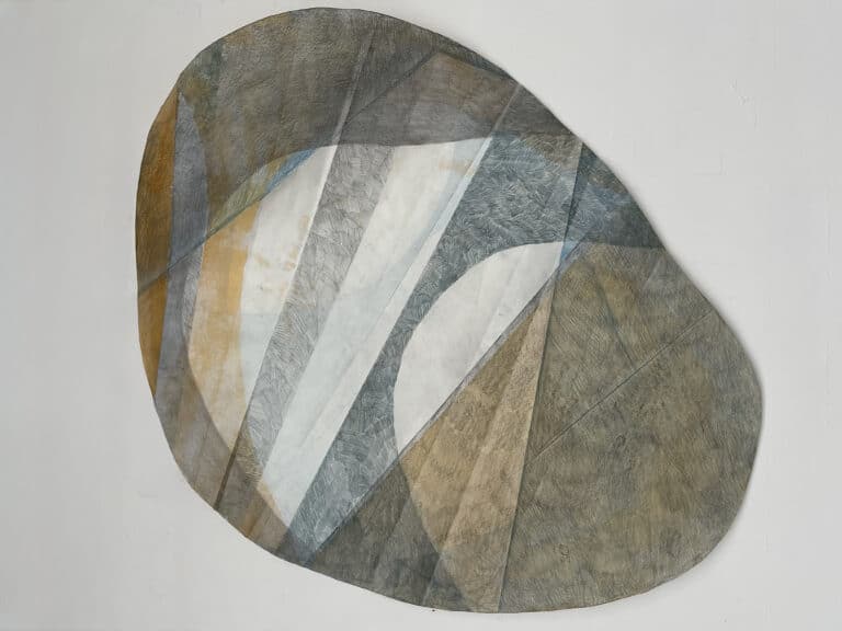 In this sense, the post-territorial being is not only physically unmoored, but cognitively dispersed, shaped as much by invisible systems of data and distraction as by the (material) architectural space of the exhibition. Here, materiality returns with new urgency: the solid, tangible presence of objects reminds us that art, like territory, can still assert form and friction. These objects are anything but simple. Surfaces that at first appear flat reveal themselves to be the result of meticulous attention; layers of gesture, resistance, care. In the age of the instantly rendered, the slow labour of making becomes an act of insistence.